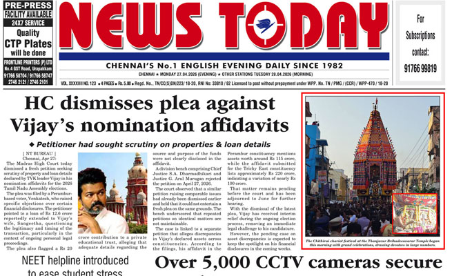 The Madras High Court today dismissed a fresh petition seeking scrutiny of property and loan details declared by TVK leader Vijay in his nomination affidavits for the 2026 Tamil Nadu Assembly elections.